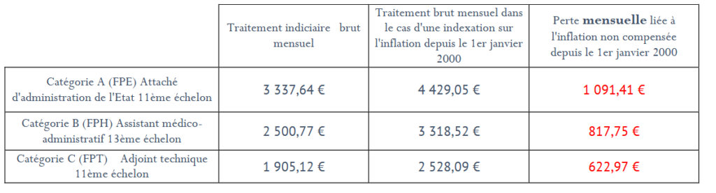 La perte mensuelle liée à l’inflation non compensée est symptomatique de cette politique de paupérisation des agents publics.