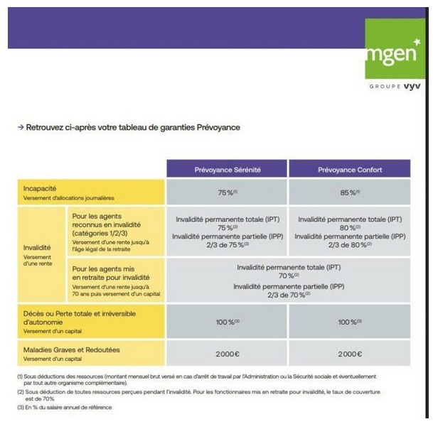 C’est cette partie que la MGEN vous propose de conserver, puisque l’adhésion au contrat collectif prévoyance du ministère est facultative (et proposée par cette même MGEN, qui est donc gagnante dans tous les cas !). Bien difficile de comparer car les conditions du contrat collectif ne sont toujours pas officiellement connues. Or, la prévoyance est un élément fondamental puisqu’elle vous permet le maintien d’une partie de votre traitement en cas de maladie ou d’invalidité, ainsi qu’une aide pour vos proches en cas de décès. Que prévoit donc l’accord de 2023, qui fixe les conditions « minimum » ?