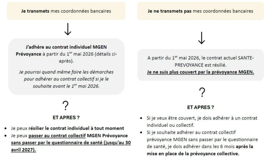 - Au 1er mai 2026, fin des anciens contrats individuels MGEN en santé et en prévoyance pour ceux qui auront basculé vers la PSC Santé du ministère,