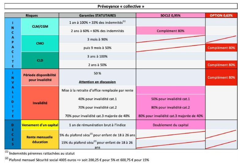 - Serait également compris un an de traitement versé aux ayants droits en cas de décès et une prise en charge de l’invalidité de 50 à 80 % selon les catégories.