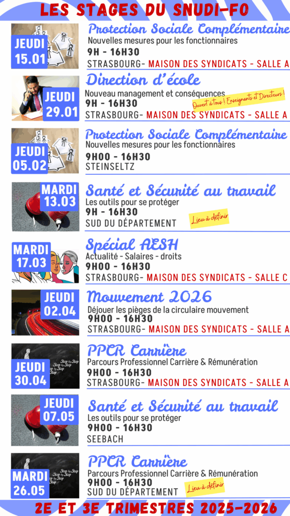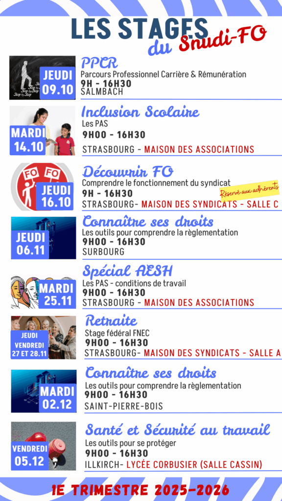 Le calendrier 2025-2026 des stages organisés par le Snudi-FO est mis en ligne au fur et à mesure de la confirmation des dates et surtout des lieux de stage !